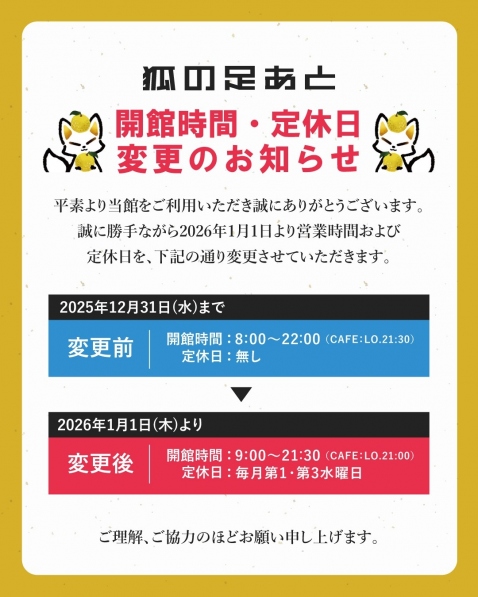 狐の足あと 営業時間・定休日変更のお知らせ